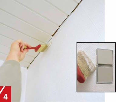 Slip veggene når de har tørket et døgn. Du kan med fordel bruke et skaft som slipeklossen sitter på. Bare i hjørner og langs listene må du slipe for hånd. Veggene skal slipes helt glatte. Fei veggene rene for støv.