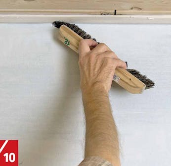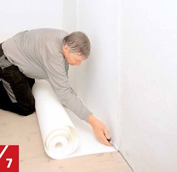 Bruk en tapetkost når du skal trykke filten fast i limet. Bruk eventuelt en gummirull. Skjær til filten langs taket og gulvlista.