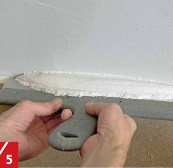 Trekk på sandsparkelmassen med en bred malersparkel. Begynn nedenfra, og trekk den på i en halv meters bredde fra gulvlista og oppover. Deretter trekker du på litt lenger oppe og «kjører» ned i det som nettopp er sparklet. Da unngår du kanter i sparklingen.