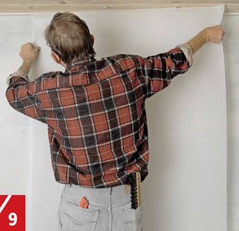 Trykk Problemløseren fast på veggen med en bred gummirull slik at den sitter godt fast i limet og luftblærer fjernes. Du kan med fordel rulle over tapetbanene igjen når de har sittet 5 til 10 minutter.