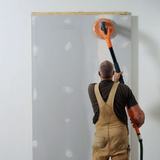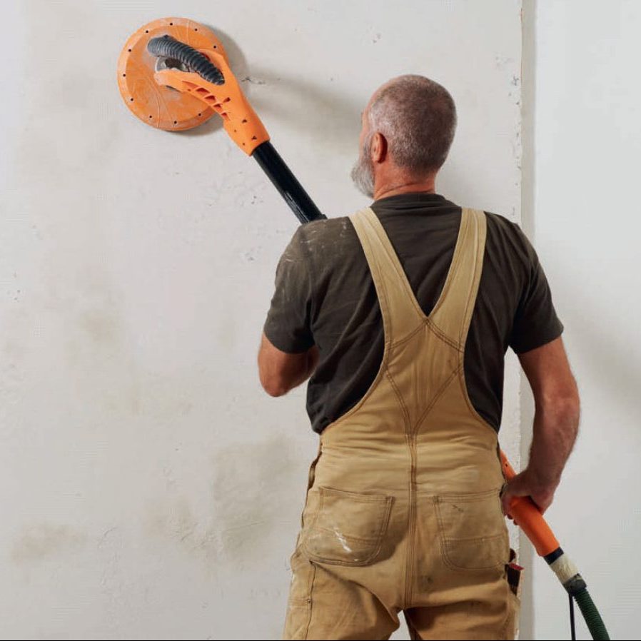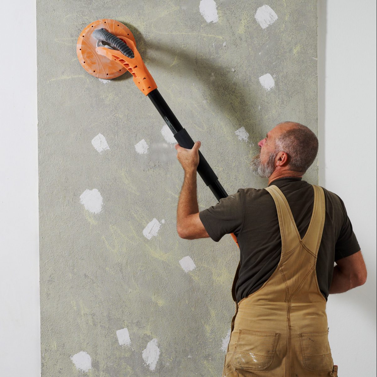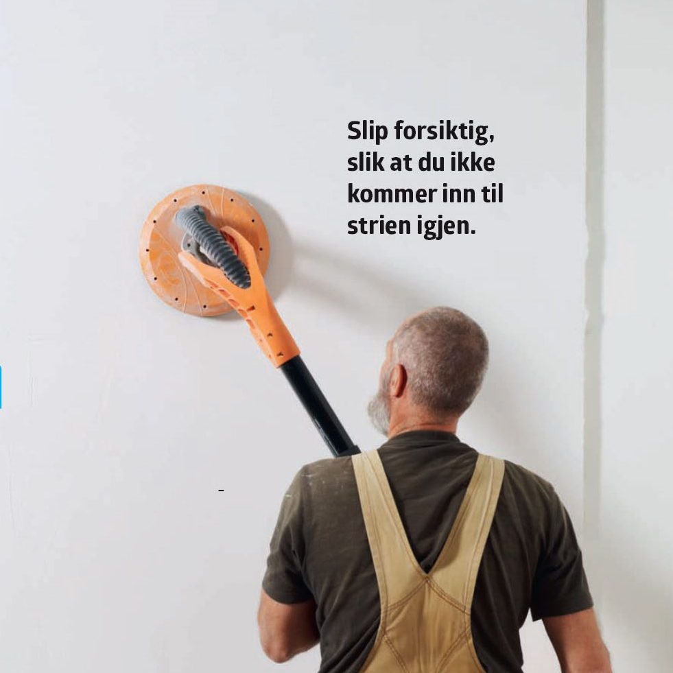 Slip hele veggen glatt. Du kan slipe med håndkraft (da vil vi anbefale slipeplater du kan sette slipepapir på) eller med en giraffsliper, som her. Giraffsliperen er rask, sikrer et jevnt resultat og kan kobles til en støvsuger (og det støver!).