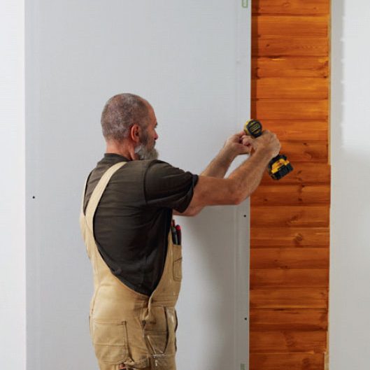 Skru fast en gipsplate. Underlaget av tre gjør det til en lek - det er jo skrufast underlag overalt.