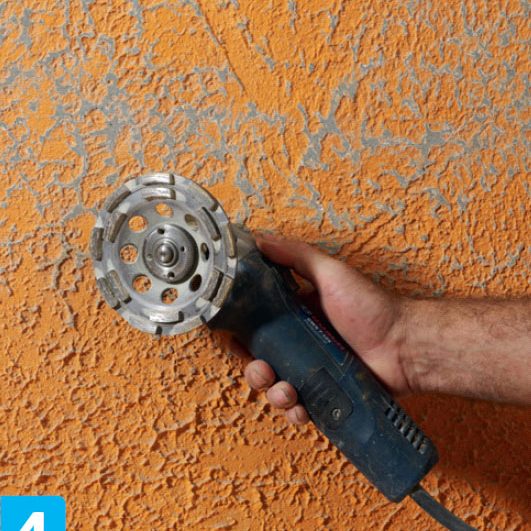 Hvis du vil bruke maskinkraft, kan en slipekopp til vinkelsliperen anbefales. Men husk å koble til en støvsuger. Og bruk vernebriller og maske!