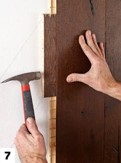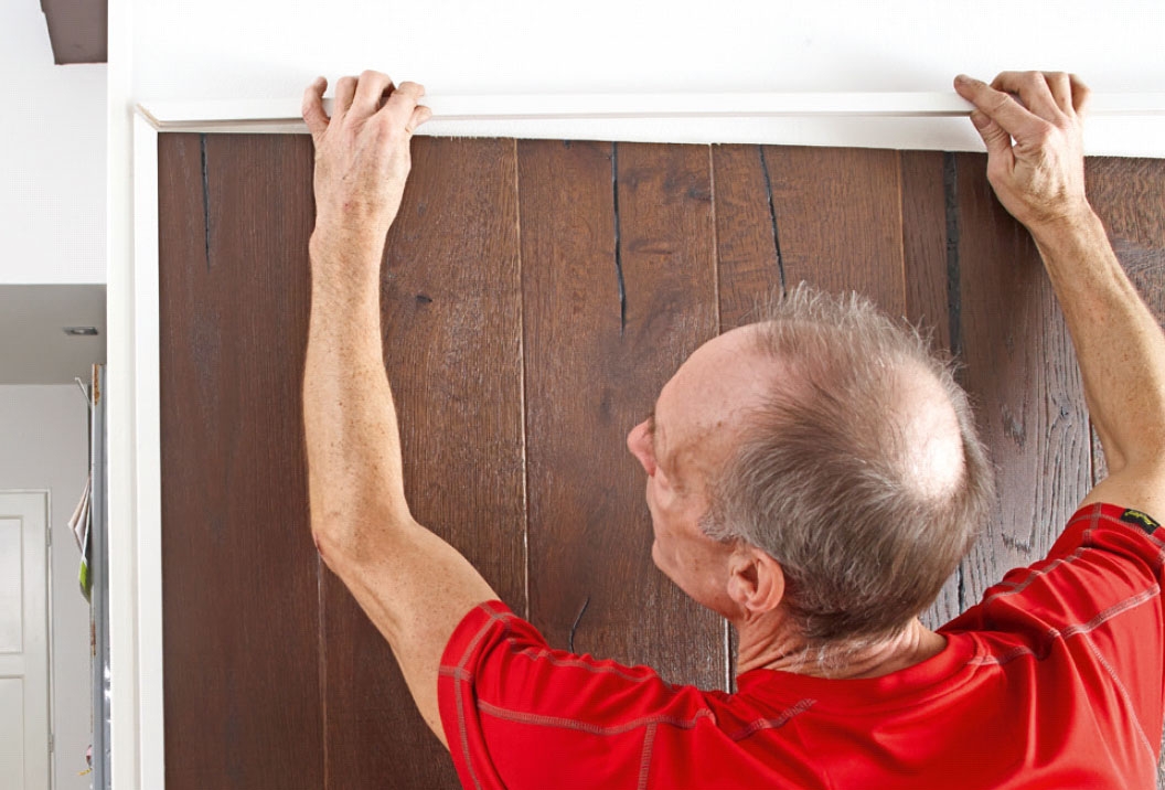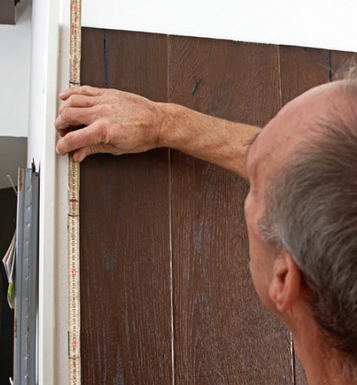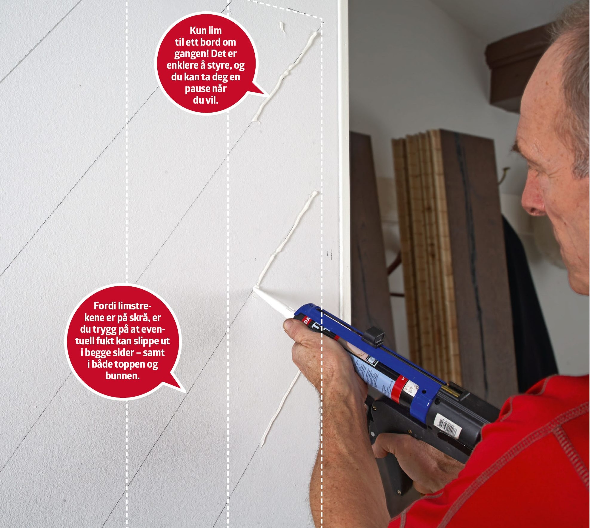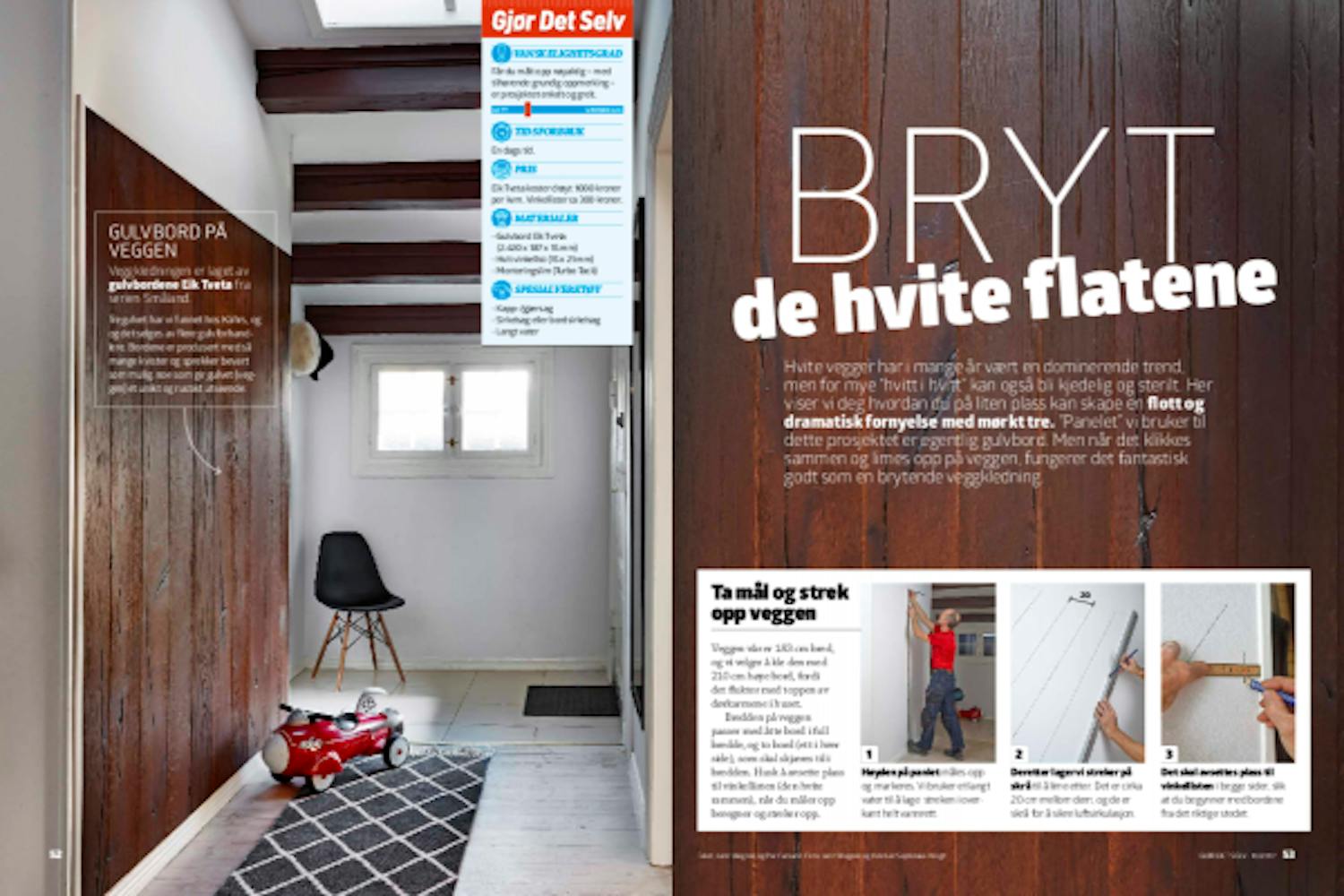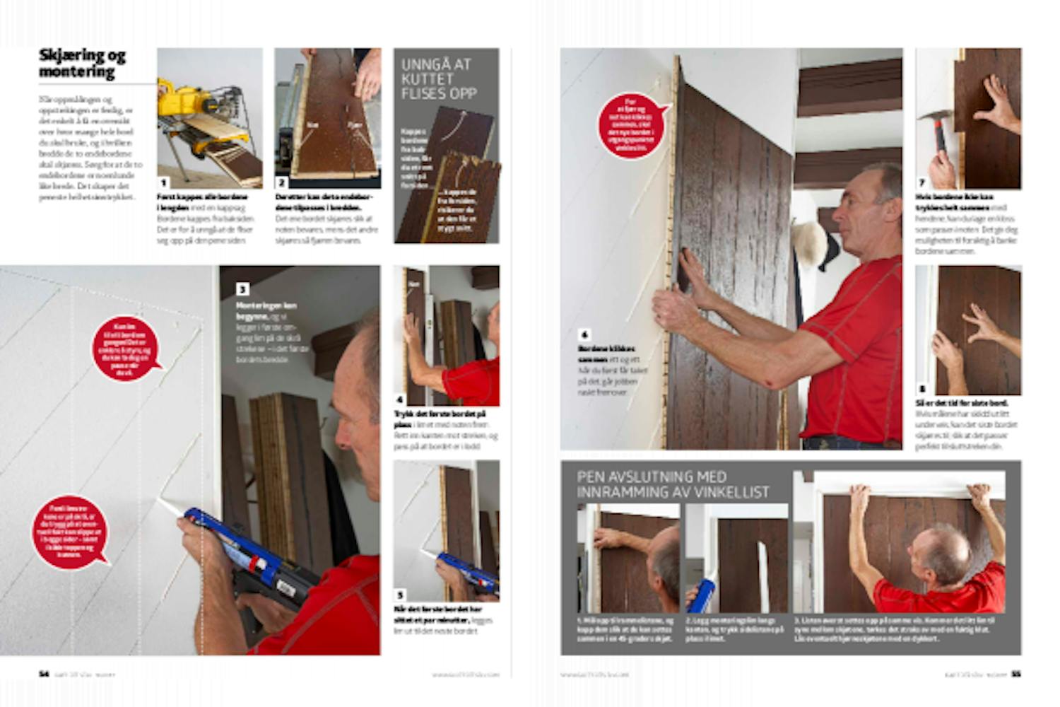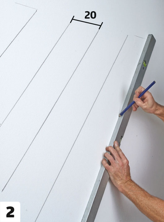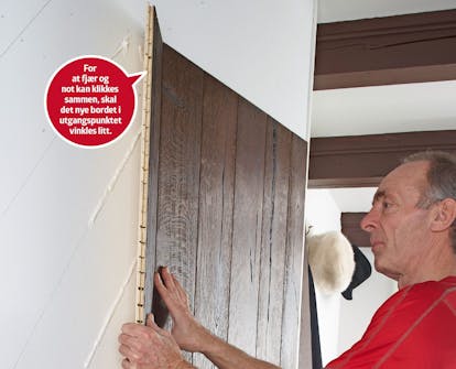 Bredden på veggen passer med åtte bord i full bredde, og to bord (ett i hver side), som skal skjæres til i bredden. Husk å avsette plass til vinkellisten (den hvite rammen), når du måler opp beregner og streker opp.