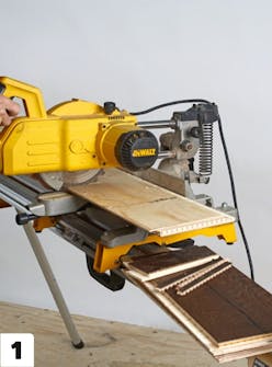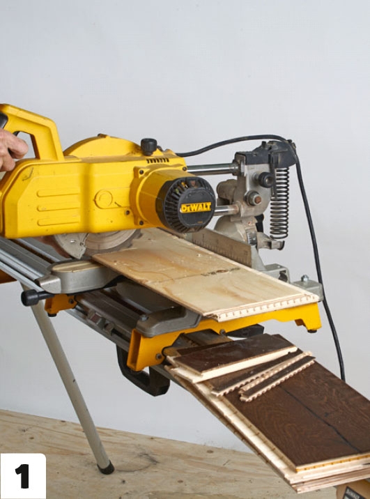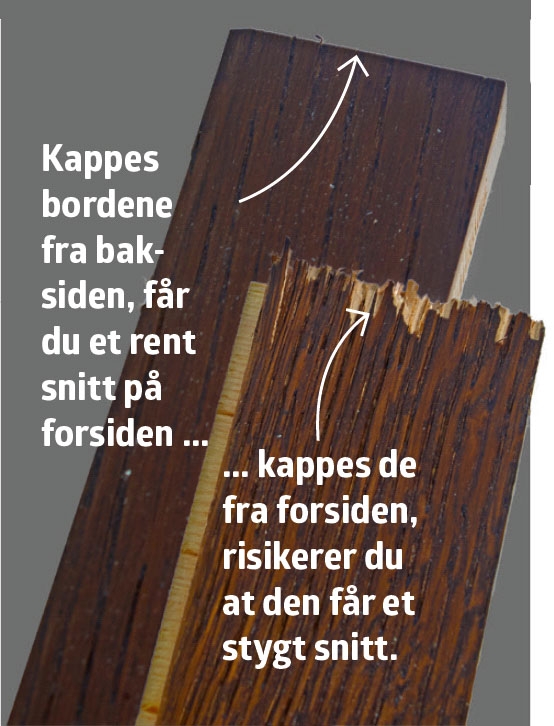 Først kappes alle bordene i lengden med en kappsag. Bordene kappes fra baksiden. Det er for å unngå at de fliser seg opp på den pene siden.
