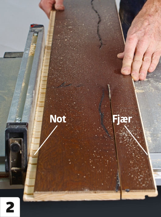 Deretter kan de to endebordene tilpasses i bredden. Det ene bordet skjæres slik at noten bevares, mens det andre skjæres så fjæren bevares.