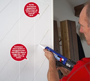 Deretter lager vi streker påskrå til å lime etter. Det er cirka 20 cm mellom dem, og de er skrå for å sikre luftsirkulasjon.