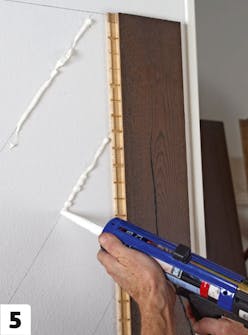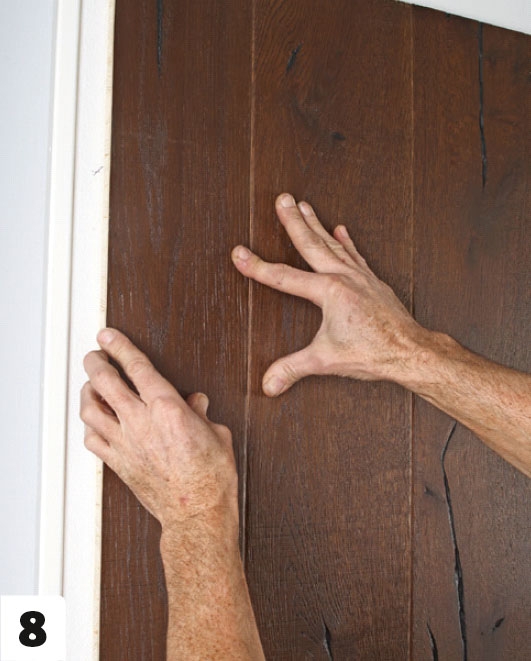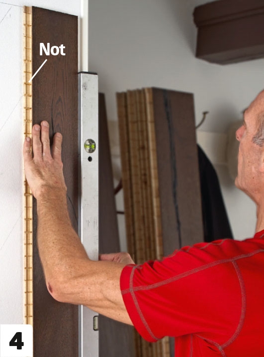Trykk det første bordet på plass i limet med noten frem. Rett inn kanten mot streken, og pass på at bordet er i lodd.