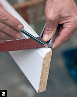 Bruk baksiden av vinkelen til å tegne opp en 45 graders strek som krysser den profilerte delen av fotlisten.