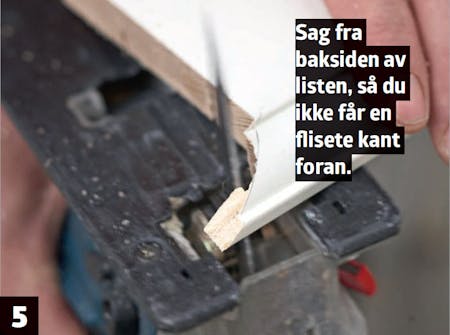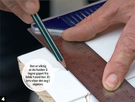 Listene kan nesten settes sammen nå. Du mangler bare å lage plass til tretannen som stik ker ut. Hold listen over den monterte delen. Riss opp rundt tannen, fra hjørnet og ut.