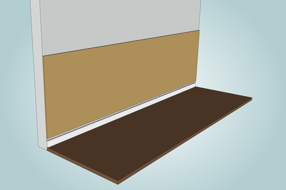 Bakplaten, som vi setter over den eksisterende fotlisten, limer vi fast med montasjelim. Bare der veggen er litt ujevn, støtter vi platene med skruer.