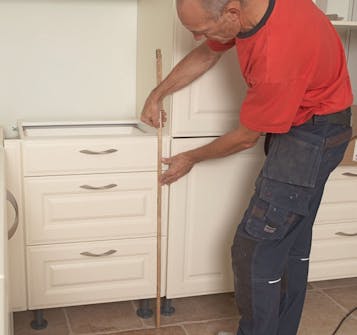 Før du kan gå i gang med å sette opp panelet, er det litt planleggingsarbeid som skal være på plass. Du skal blant annet bestemme deg for hvor høyt panelet skal gå opp på veggen. Prøv å holde en linje som f.eks. flukter med bunnen av et vindu, en fylling i en dør, eller som her; høyden på kjøkkenbenken. Det gir det mest harmoniske resultatet.