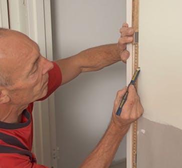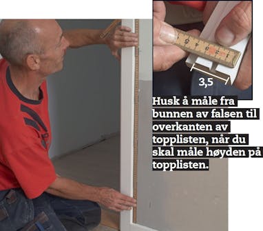 Mål opp, slik at du kan skjære til veggpanelene. Høyden på panelplatene finner du ved å måle fra oversiden av fotlisten til ferdigmarkeringen, og deretter trekke fra topplisten.