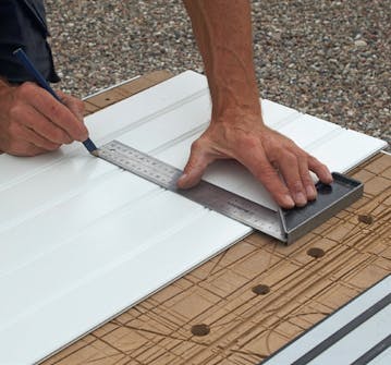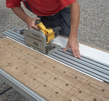 Strek opp der det skal sages på panelplatene. Sørg for at noten vender fremover i monteringsretningen. Du skal også passe på å kappe til platene i toppen, slik at du ikke sager av den malte kanten nederst på platen.