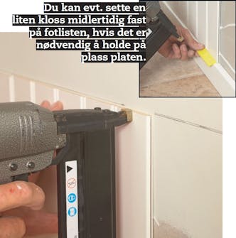 Sett evt. en dykkert i toppen av platen og en midlertidig kloss på fotlisten, for å holde platene på plass til limet er tørt. Dette trenger du bare å gjøre hvis veggen er så bulet eller skjev, at limet slipper taket uten at platen festes.