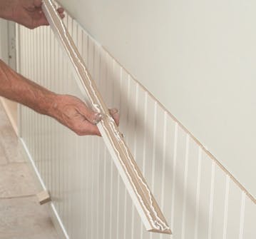 Skjær til topplisten, og lim den fast oppå platene når alle er satt opp. Gi listen et par streker lim på baksiden, og trykk den forsiktig på plass, slik at falsen ligger ned over platene. Pass på at du ikke får noe lim på veggen over listen.