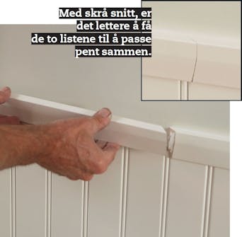 Topplisten skjøtes med et skrått snitt. Hvis listen er lang, må den skjøtes av flere lengder. Da er det en fordel å lage skjøten med et snitt på 30-45 grader. Det skrå snittet gir en større limflate, og skjøten blir penere og mer nøyaktig.
