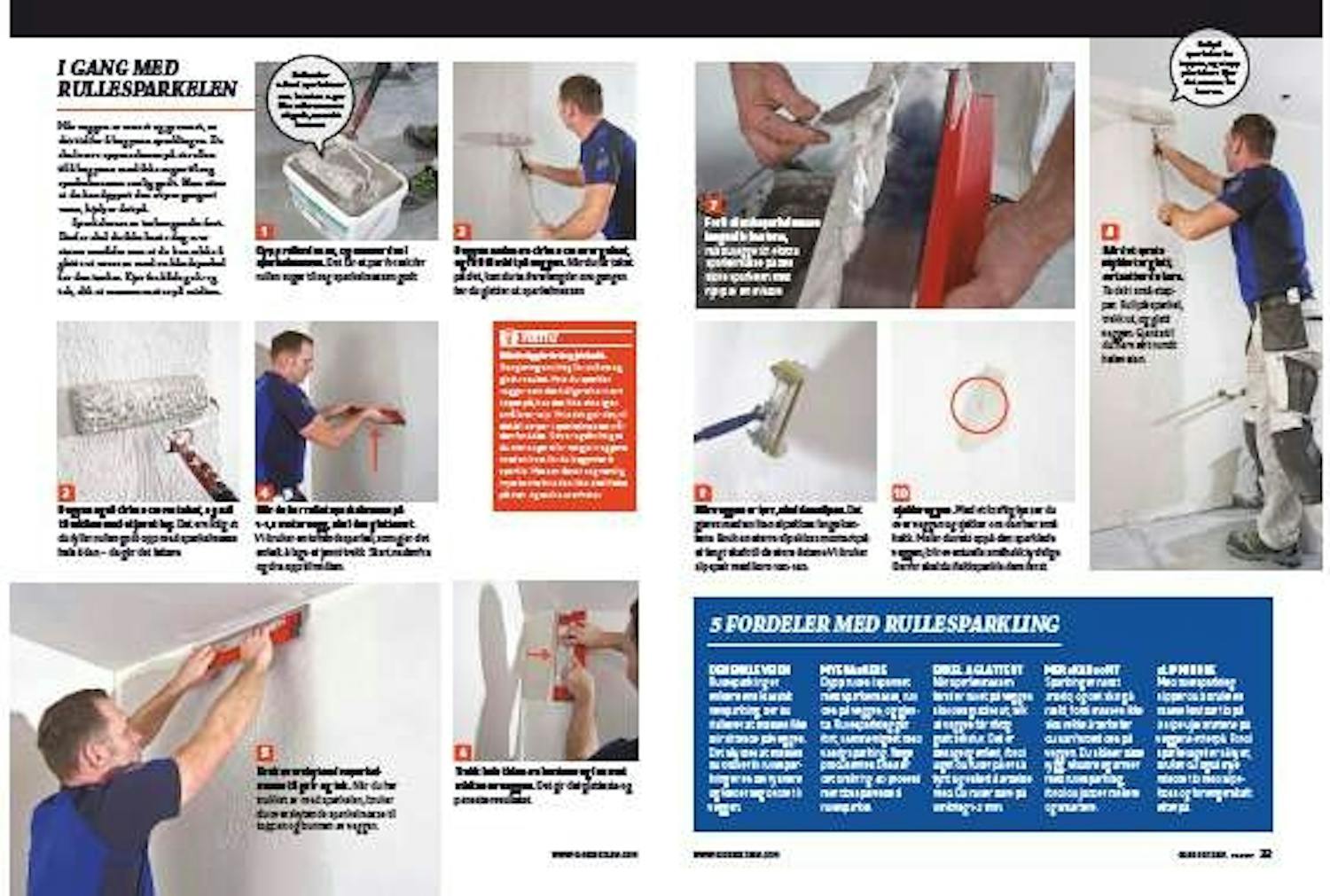 Mange av de prinsippene som gjelder for malerarbeid, gjelder også når du skal rullesparkle en vegg. Det er viktig at du bruker en god rull, for da sitter sparkelmassen lettere fast. En rull med teleskopstang er en absolutt nødvendighet, ellers kommer du til å måtte bøye og strekke deg mange ganger. Det er både raskere og mer skånsomt for ryggen hvis rullen er forlenget. Vi bruker en lettsparkelmasse til å flekk-sparkle små ujevnheter i veggen før vi ruller på rullesparkelmassen.