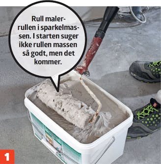 Når veggen er renset og grunnet, er det tid for å begynne sparklingen. Du skal være oppmerksom på at rullen til å begynne med ikke suger til seg sparkelmassen særlig godt. Men etter at du har dyppet den et par ganger i vann, hjelper det på.