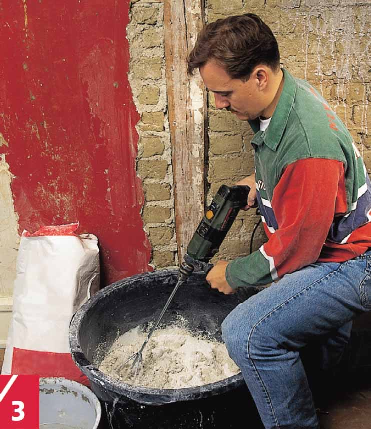 Tøm vann og tørrpuss eller gipspulver i ei stor plastbalje, og bland det grundig med en blandevisp i en sterk boremaskin.