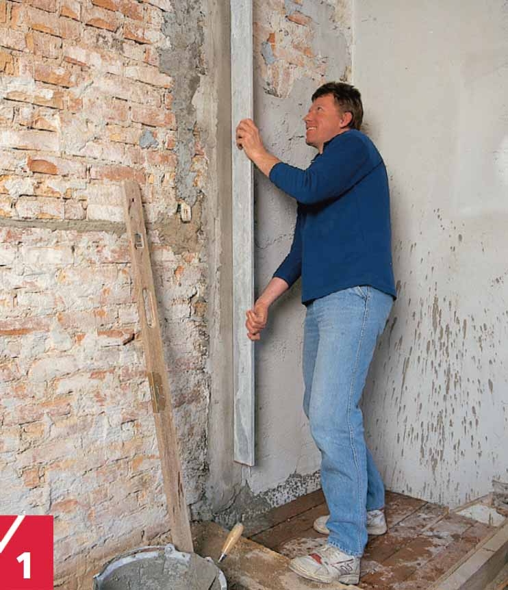 Lag loddrette lirer for hver. ca. 150 cm på veggen. Det er 10-15 cm brede striper av pussmørtel som skal være helt i lodd. Husk å vanne veggen først. Etterpå når lirene er tørket, kan du kaste ut et tynt lag pussmørtel eller legge det på med en kost.