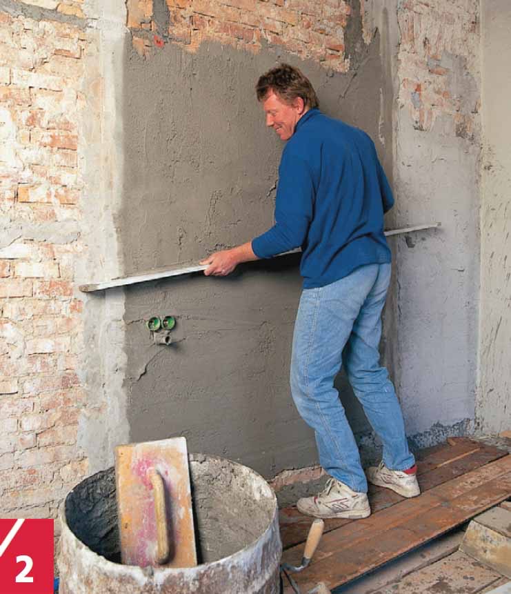 Bland ekstra store porsjoner til repara-sjon av større områder. Legg på rikelig med puss på veggen med et pussebrett, og trekk deretter av overflødig puss ved hjelp av et langt, rett bord eller ei metallskinne.