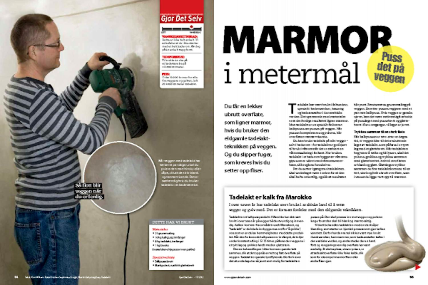 Når kalkpussen er tørr, kommer du til det morsomme: å få det finkornede pusslaget, tadelakt, lagt på veggen. Det skal danne den vanntette og blanke overflaten vi ønsker å oppnå. Det er viktig at tadelakten ikke er helt tørr før du begynner å polere den. Grunnen er at den skal kunne trykkes litt sammen i prosessen. Derfor skal du bare arbeide med én kvadratmeter vegg om gangen.