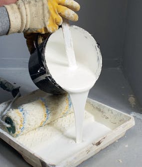Hell opp grunnmalingen i et rullebrett, og sørg for at malingsrullen er blitt vasket grundig før bruk, slik at den ikke loer på veggen.