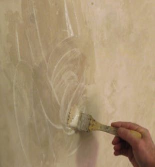 Start med å sprøyte vann på én kvadratmeter av den veggen du pusset dagen før. Vannet skal på for at fukten ikke skal trekkes ut av tadelakten når den påføres.