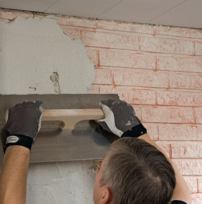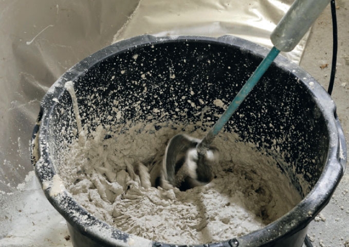 Før en mursteinsvegg kan pusses, skal den rengjøres og primes. Deretter røres gipspussen opp i et spann til en konsistens som ikke er for tørr, men så den akkurat kan stå av seg selv.