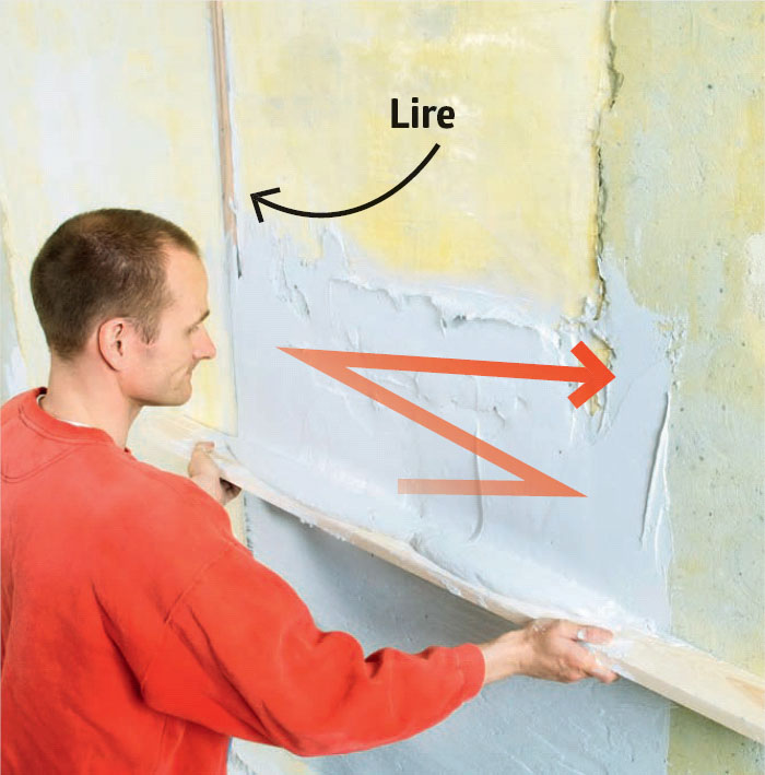 Når gipsen er trukket på, rettes den opp med et bord som kan rekke over begge lirene på veggen. Bordet holdes litt på skrå mot lirene, og føres oppover fra side til side.