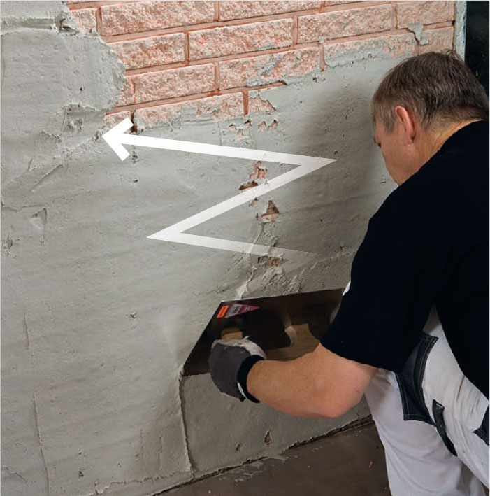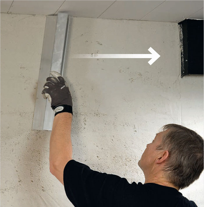 Det er ikke mulig å trekke på puss helt opp til taket. Derfor må du snu pussebrettet og trekke nedover. Har pussen riktig konsistens, blir den hengende pent igjen på veggen.