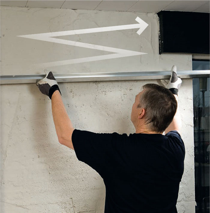 Fortsett avrettingen ved å føre bordet eller skinnen vannrett over pussen. Det er også slik du retter opp veggen oppunder taket. Et kortere bord på cirka 0,5 m kan anbefales her.