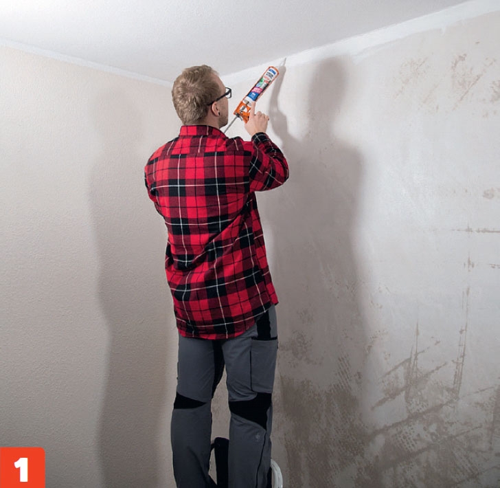 Akrylfugemassen presses godt inn i hjørnet og litt innover tapetet på de tilstøtende veggene. Akrylfugemassen beskytter tapetet mot å løsne.