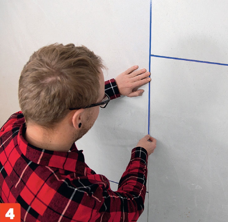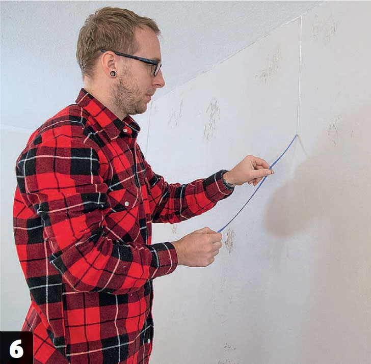 Sett vinylteip langs strekene. Teipen skal trykkes godt fast til underlaget, slik at det ikke kommer inn gipspuss på baksiden.