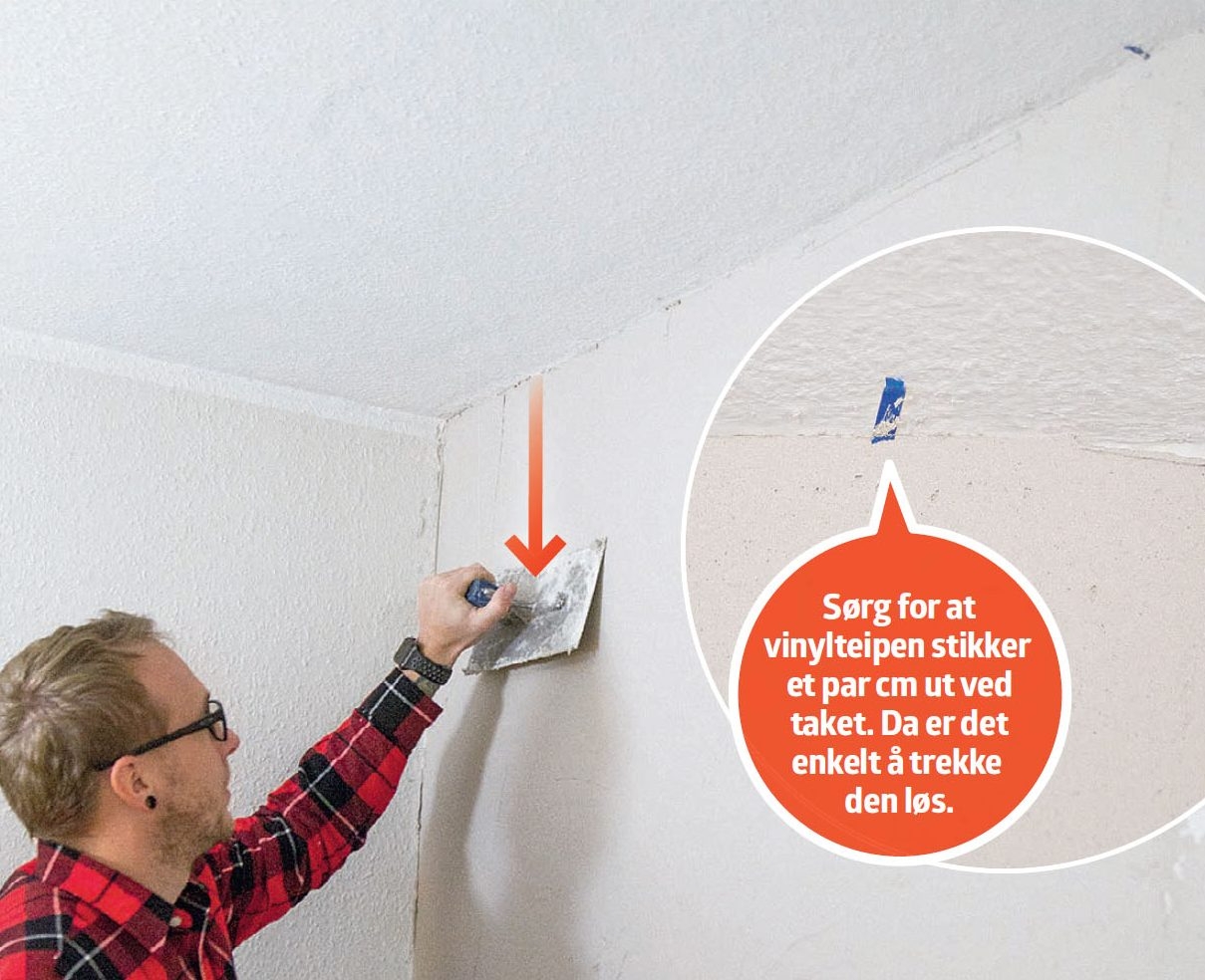 Fug langs kanten av veggen med en akrylfugemasse når du har forsikret deg om at underlaget til veggen er fast, og du har fjernet eventuell tapet, som her.