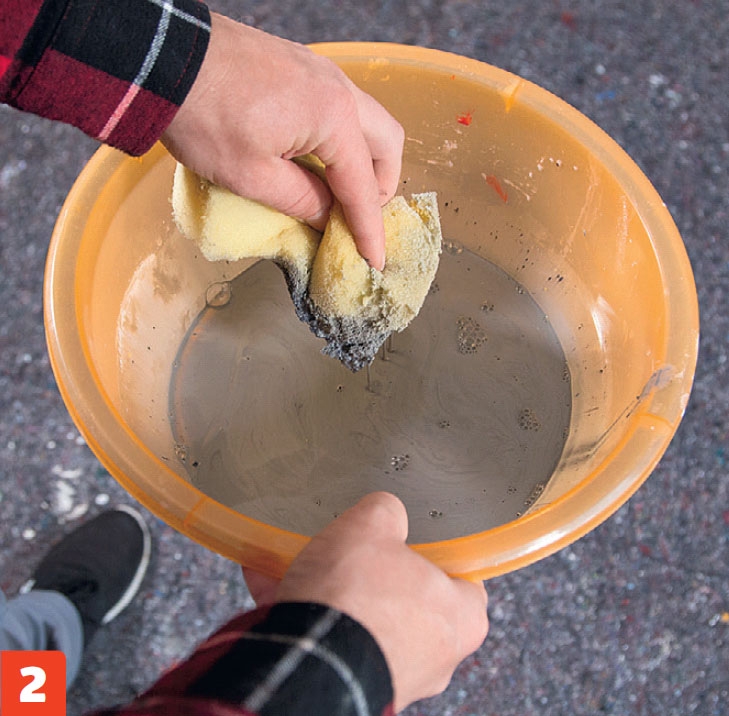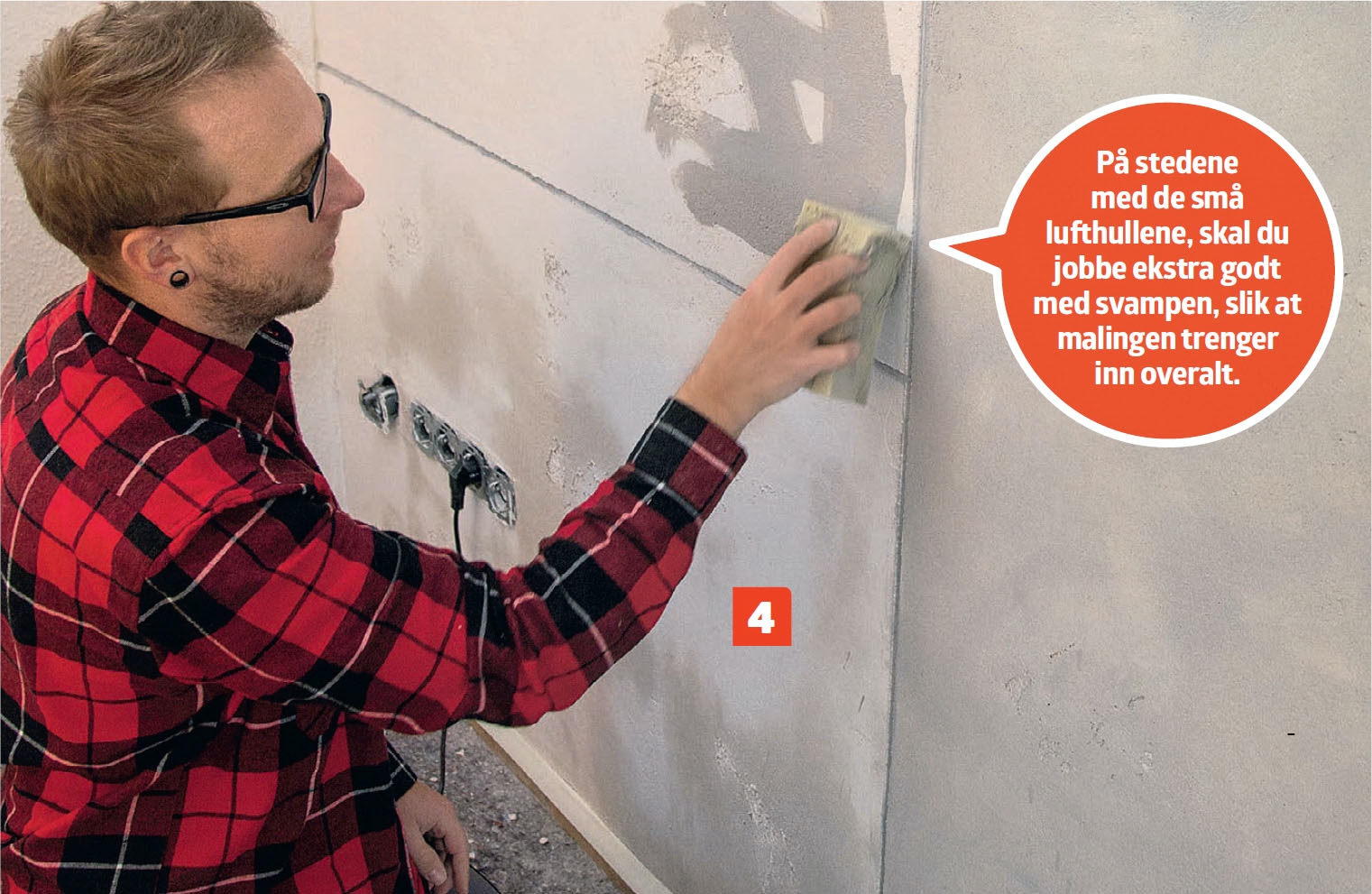 De store veggflatene males med en svamp. Det forsterker betonginntrykket, og gjør det enklere å male der du har laget små lufthull i veggflaten.