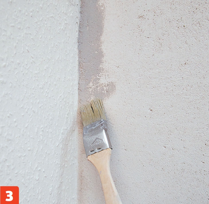 Veggen males med en grå, vannbasert maling, som minner så mye om betong som mulig. Første strøk fortynnes litt med vann, som en slags grunning.