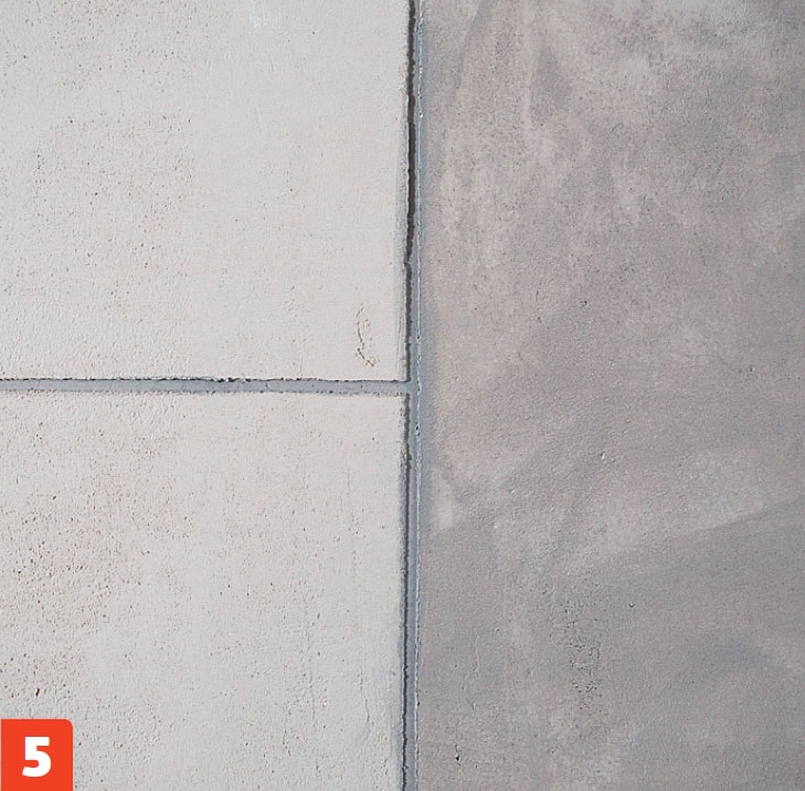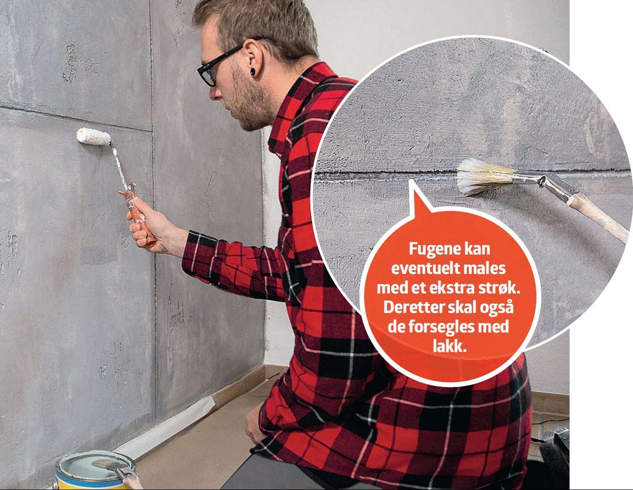 Nå skal veggen males grå, slik at den får helt riktig betongutseende. Fugene males i en litt mørkere nyanse enn de store flatene. Da blir de fremhevet, og forsterker illusjonen av at veggen er laget av betongelementer.