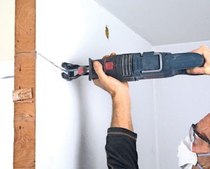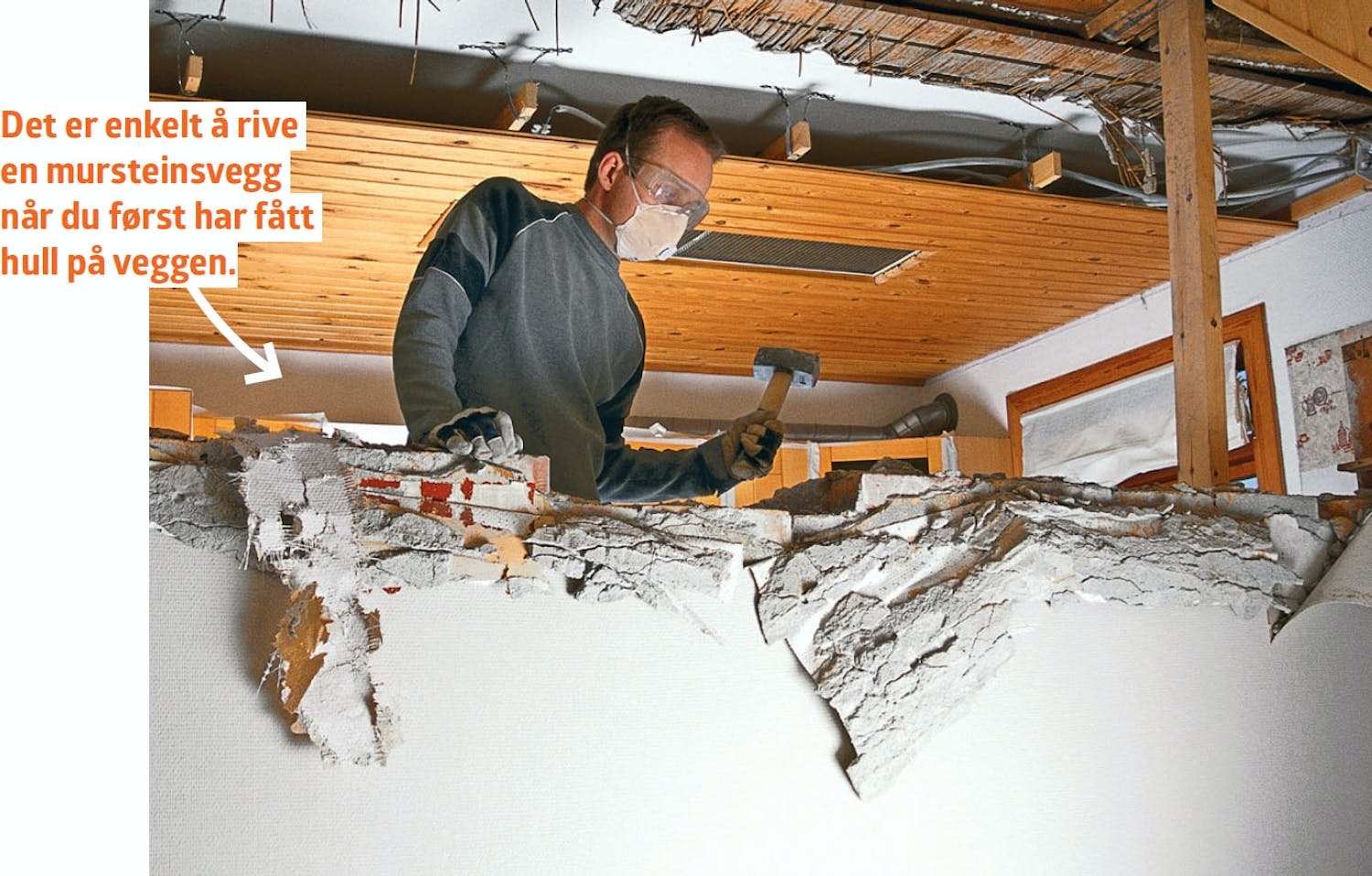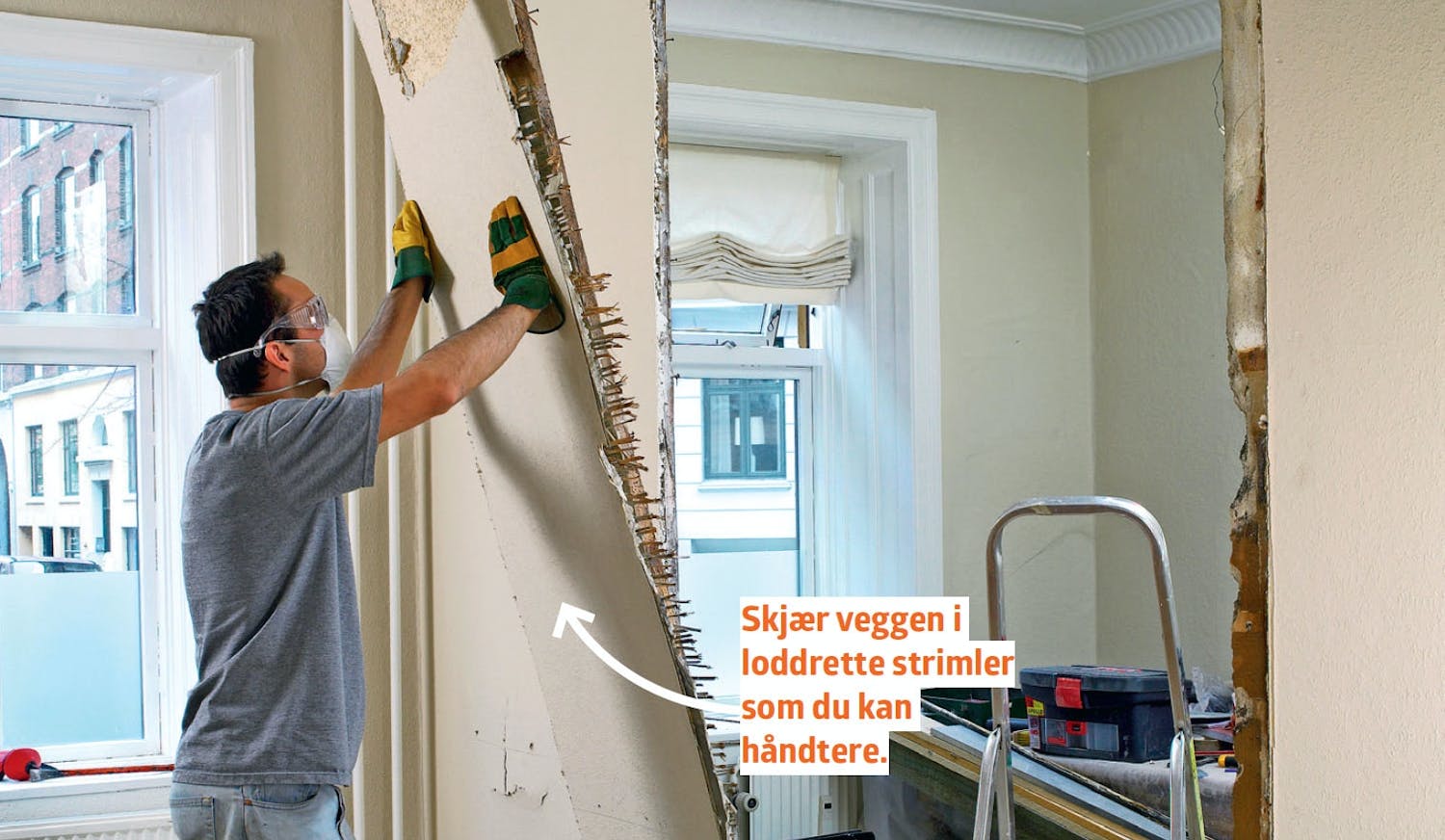 Fjern alle lister og annet som er montert på veggen. Hvis veggen er fuget tett mot de tilstøtende veggene og til taket, skjæres fugen opp slik at det blir så lett som mulig å reparere skadene. Start nedbrytingen øverst under taket med en bajonettsag. Skjær et vannrett snitt på 20-30 cm.