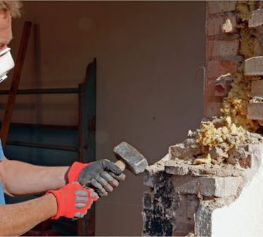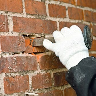 De første par steinene fjernes ved å krafse, frese, bore og banke vekk fugene rundt steinene. Velg stein i en av de øverste rekkene og ute i den ene siden av veggen. Det tar litt tid å få hull på veggen, men deretter går det fort.