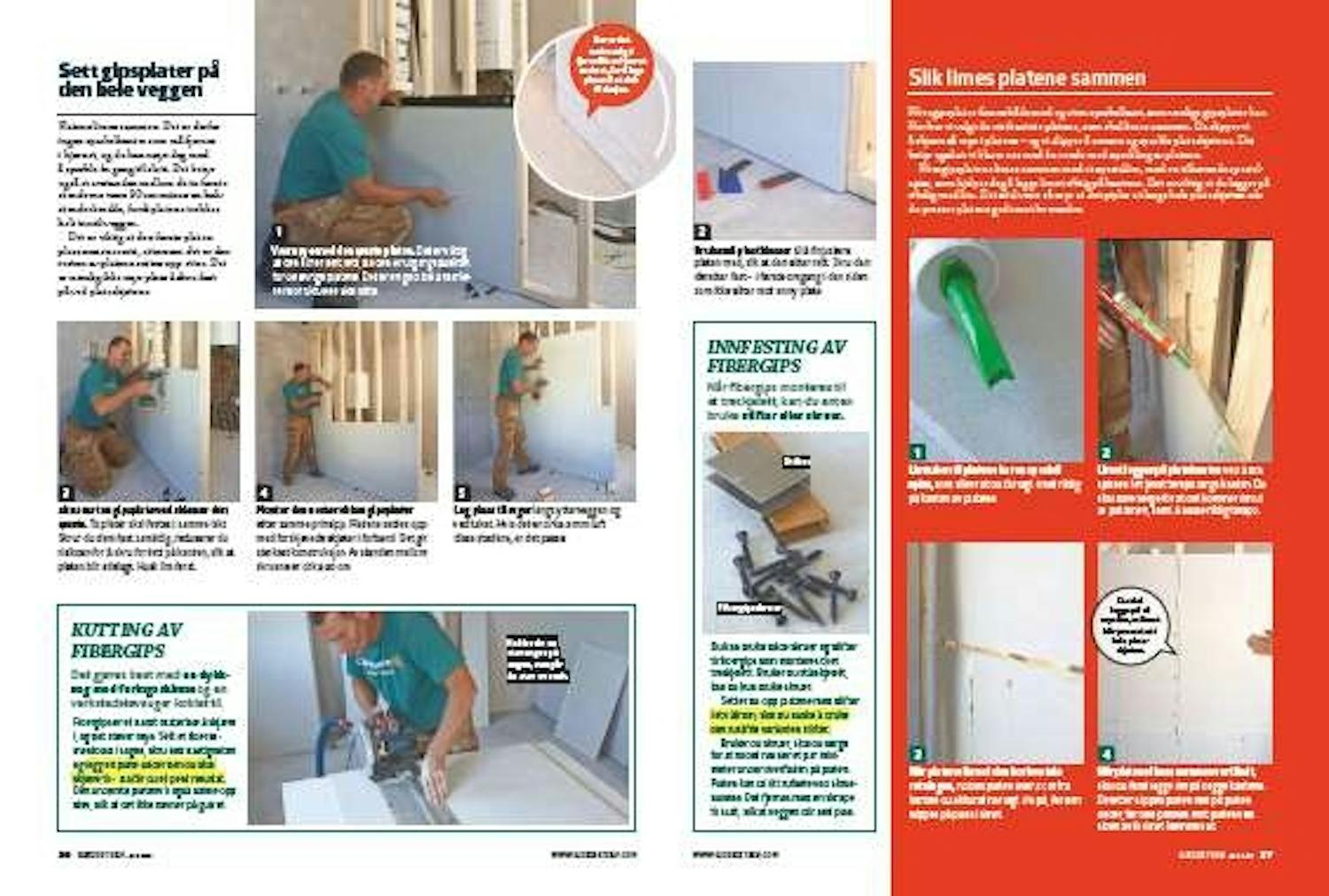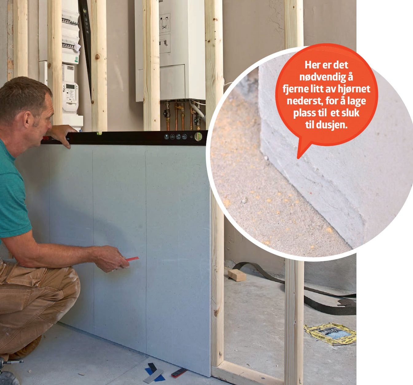 Fibergipsplater finnes både med og uten sparkelkant, som vanlige gipsplater har. Her har vi valgt de rettkantete platene, som skal limes sammen. Da slipper vi å skjære så mye i platene - og vi slipper å armere og sparkle plateskjøtene. Det betyr også at vi klarer oss med én runde med sparkling av platene.