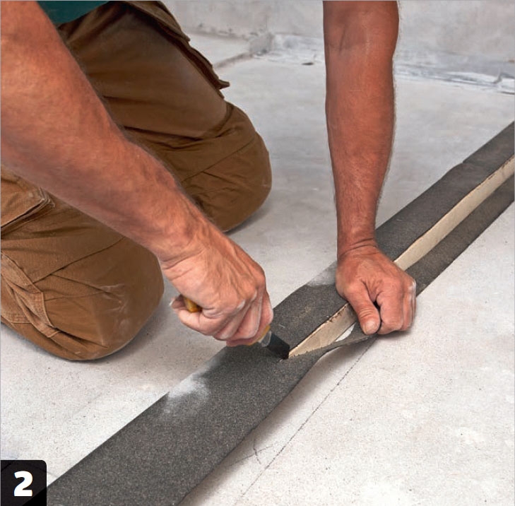 Sett murpapp under bunnlekten, og skjær den til slik at det ikke kan trenge opp fukt i treet fra betonggulvet. I forkant er lekten kappet til i lengden med en kapp-/gjærsag.