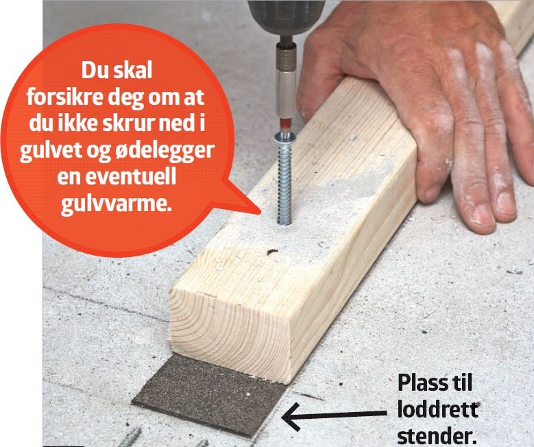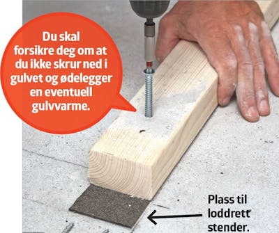 Skru fast bunnlekten. Her brukes 7,5 x 72 m monteringsskruer, som skrus rett ned i et forboret hull i gulvet. Skruene plasseres for hver 50 cm. Merk deg at det er laget plass til en stender i enden.