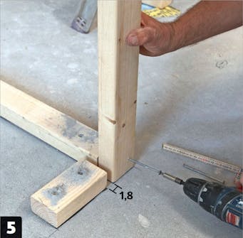 Monter de loddrette stenderne i enden av bunnlekten, bakerst på ytterveggen og fremst, der den møter den andre veggen. Det er viktig at de er 100 prosent i lodd. Da er det enkelt å montere døren til slutt.