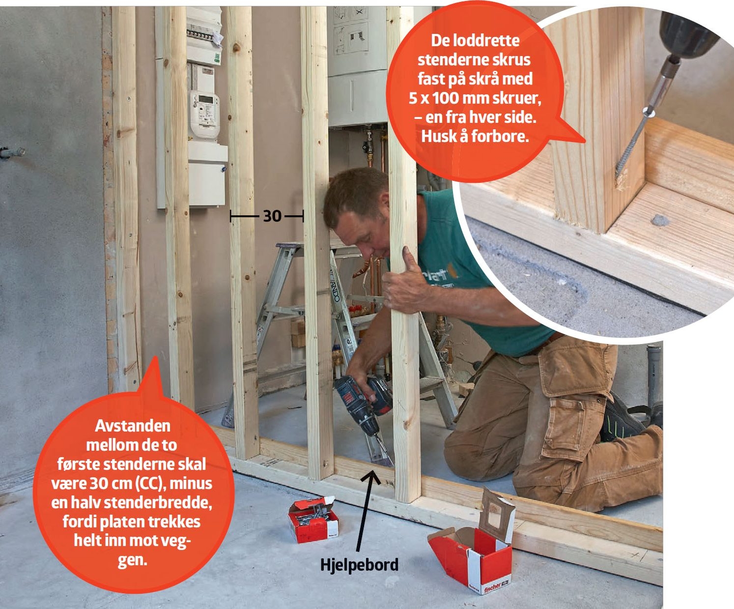 Sett opp stenderne til veggen med døråpningen. Endelekten skrus direkte fast til veggen vi akkurat har laget. Det gir et sterkt hjørne. Her plasseres døren tett mot den første veggen, i en avstand på 10 cm.