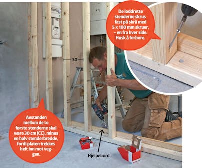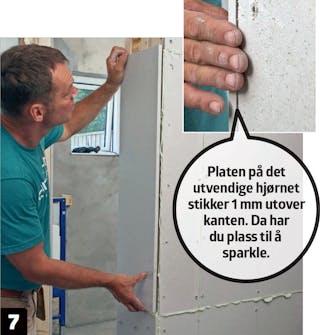 Platene limes sammen. Det er derfor ingen sparkelkanter som må fjernes i hjørnet, og du kan nøye deg med å sparkle én gang til slutt. Det betyr også at avstanden mellom de to første stenderne være 30 cm minus en halv stenderbredde, fordi platene trekkes helt inntil veggen.