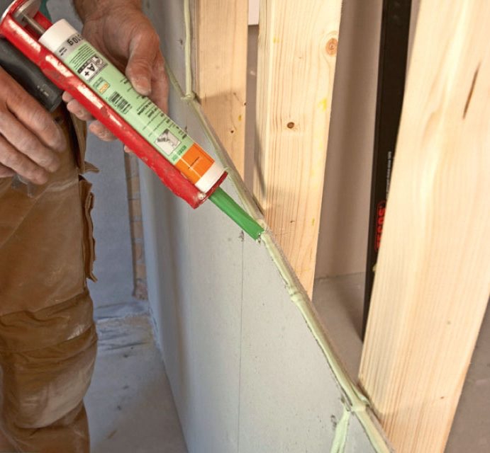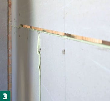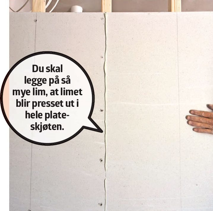 Fibergipsplatene limes sammen med et spesiallim, med en tilhørende spesial spiss, som hjelper deg å legge limet riktig på kantene. Det er viktig at du legger på rikelig med lim. Det skal være så mye at det pipler ut langs hele plateskjøten når du presser platene godt mot hverandre.
