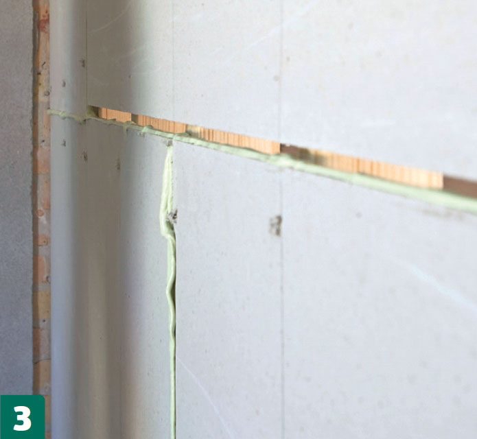Veggen kles med fibergipsplater som på den andre veggen - de plasseres i forband, limes sammen og skrus fast.