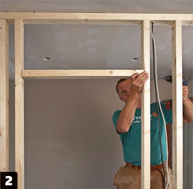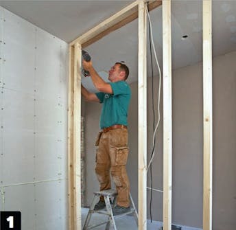 Skru fast topplektene i taket. Her består taket av skrufaste fibergipsplater, så lektene kan skrus fast med vanlige sponskruer. De to ledningene fra taket er til brytere som skal være ved døren.